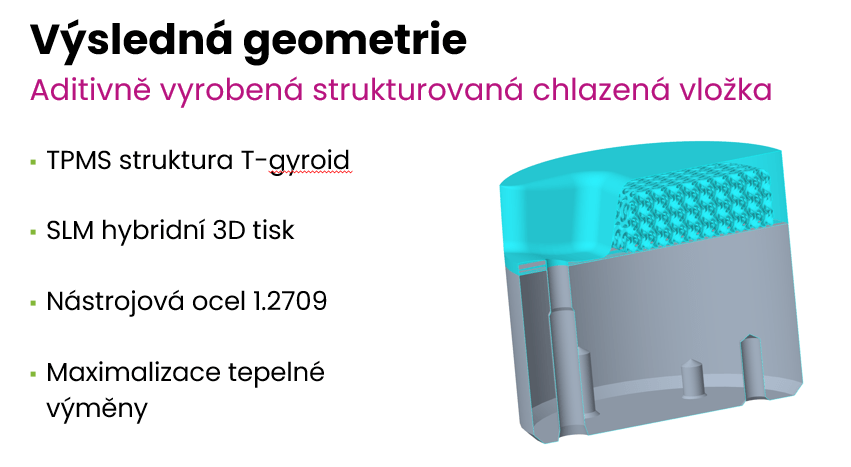 Hybridní konstrukce umožňuje integrovat do formy chladicí kanály s geometriemi, které nelze odvrtat – a výrazně tak zrychlit výrobní cykly.