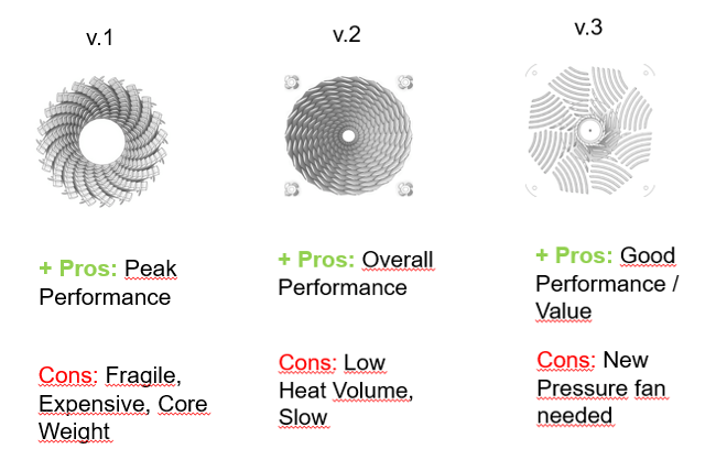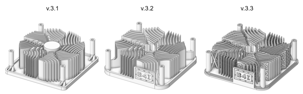 Proces začal návrhem tří různých konceptů tepelného rozvaděče, které byly vyhodnoceny z hlediska mechanické odolnosti, účinnosti přenosu tepla, nákladů i připravenosti pro výrobu. Vývoj probíhal v režimu rychlého prototypování, kdy jednotlivé návrhy byly iterativně testovány, upravovány a opakovaně tištěny.